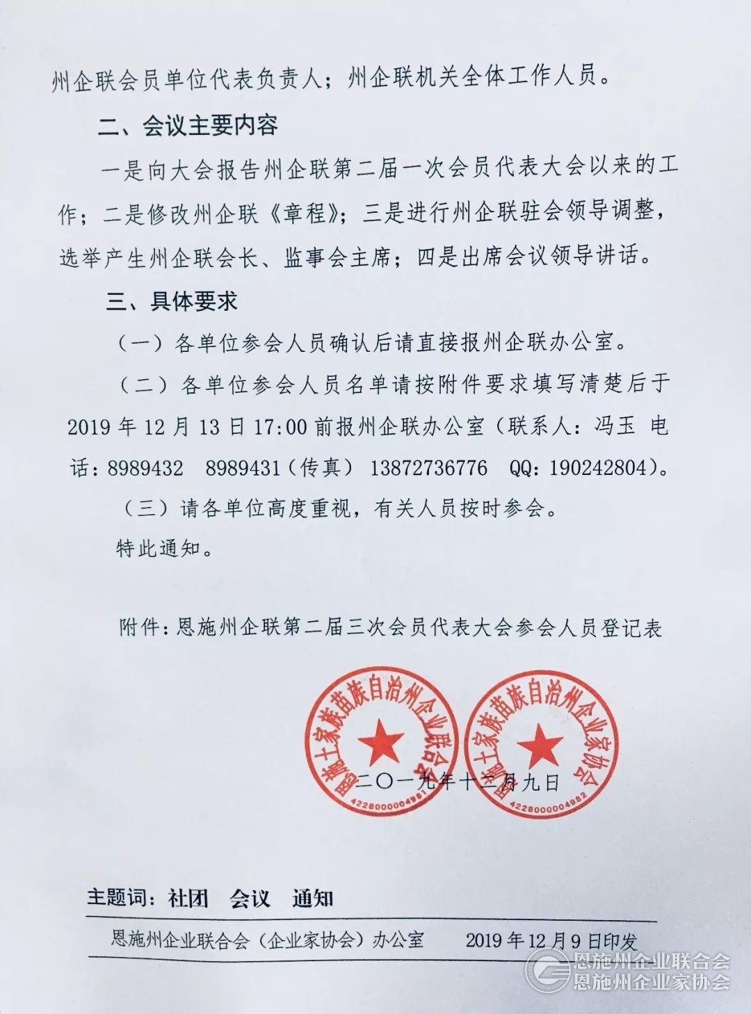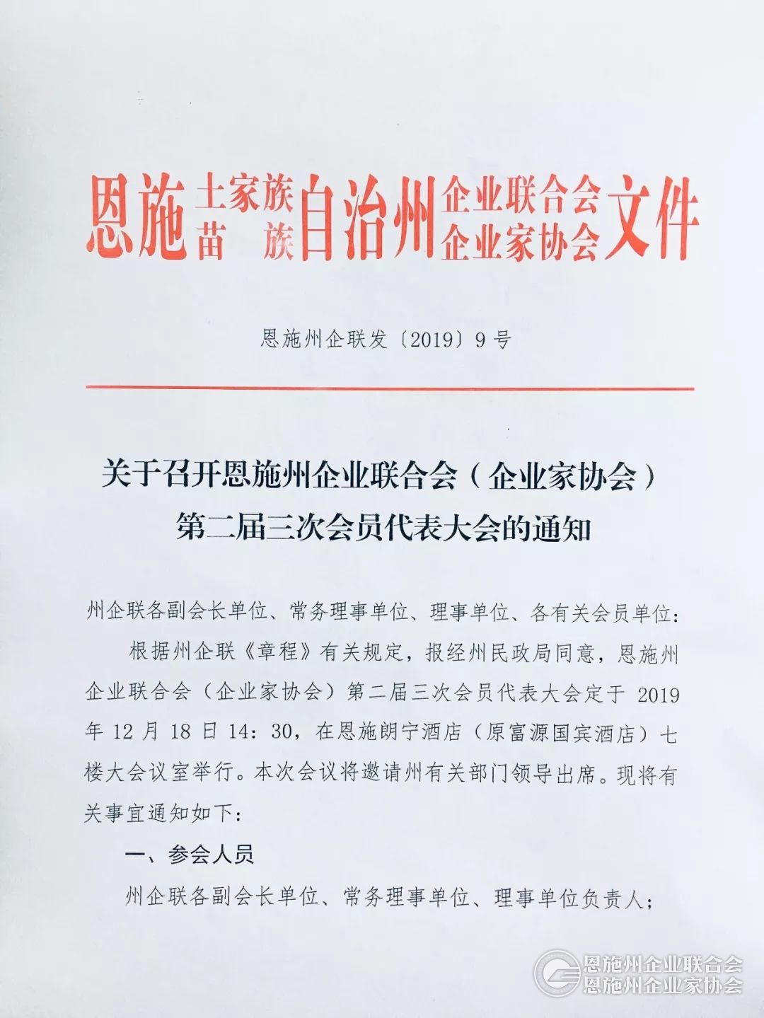 关于召开恩施州企业联合会(企业家协会)第二届三次会员代表大会的通知