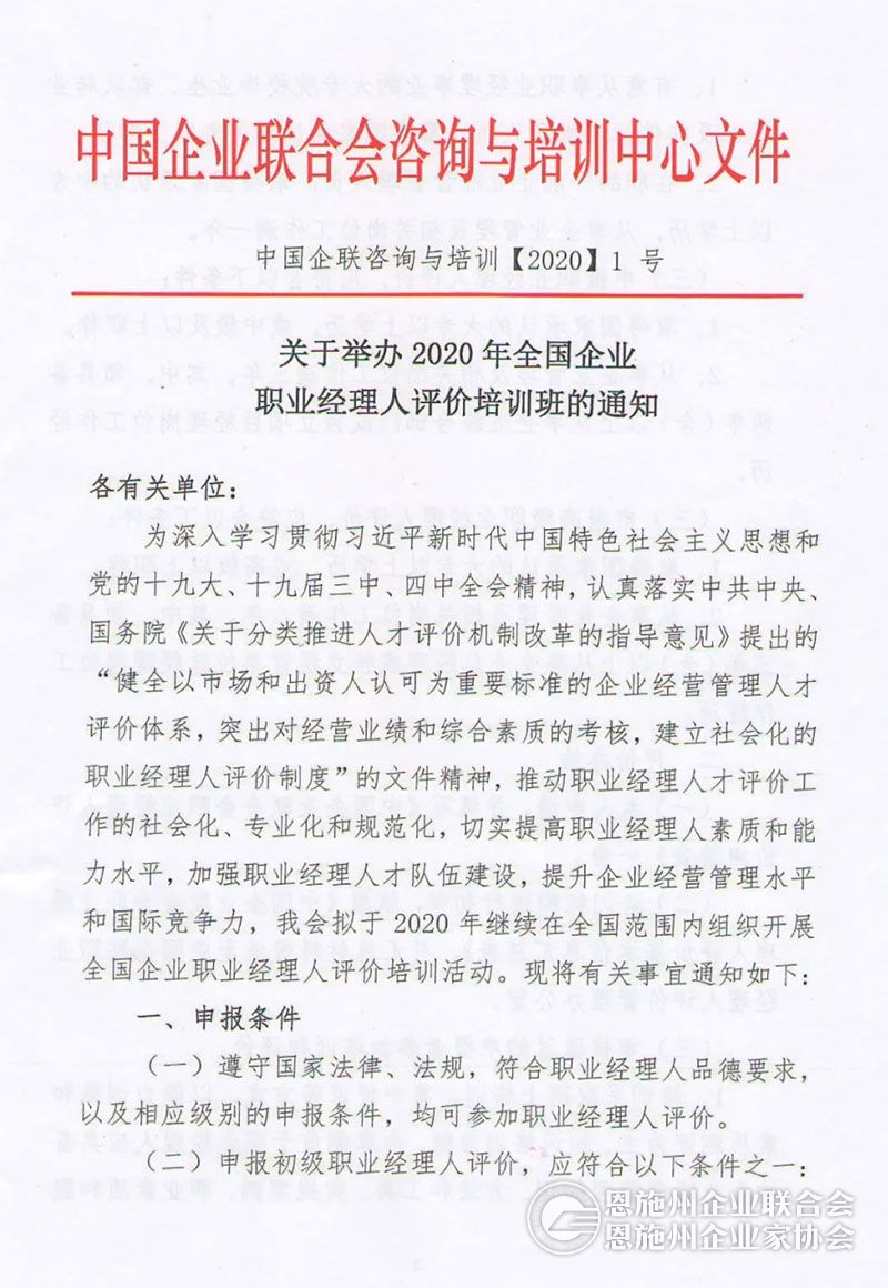 中企联关于举办2020年全国企业职业经理人评价培训班的通知