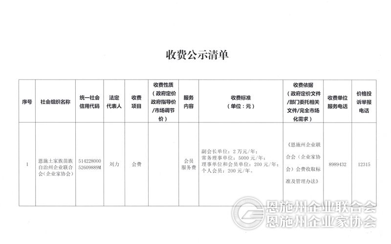 恩施州企业联合会会费收取标准公示
