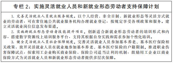支持多渠道灵活就业和新就业形态发展。破除各种不合理限制,建立促进多渠道灵活就业机制,支持和规范发展新就业形态。鼓励传统行业跨界融合、业态创新,增加灵活就业和新就业形态就业机会。加快落实《关于维护新就业形态劳动者劳动保障权益的指导意见》,建立完善适应灵活就业和新就业形态的劳动权益保障制度,引导支持灵活就业人员和新就业形态劳动者参加社会保险,提高灵活就业人员和新就业形态劳动者社会保障水平。规范平台企业用工,明确平台企业劳动保护责任。健全职业分类动态调整机制,持续开发新职业,发布新职业标准。