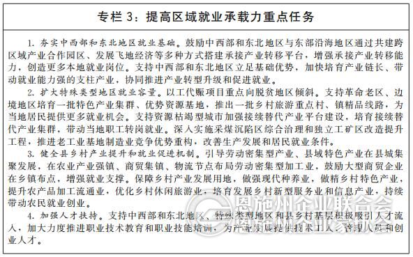 推动区域就业协调发展。支持东部地区发挥创新要素集聚优势,率先实现产业升级,开拓高质量就业新领域,培育高质量就业增长极。加快完善中西部和东北地区基础设施,提升产业集聚区公共服务效能,引导产业向中西部和东北地区有序梯度转移,推动就业机会向中西部和东北地区扩散。支持中西部和东北地区根据国家战略导向和发展重点,对接先进生产要素和创新资源,发展特色优势产业,改造提升传统产业,积极布局新兴产业,厚植就业创业沃土。