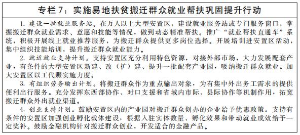 稳定脱贫人口就业。健全脱贫人口、农村低收入人口就业帮扶长效机制,保持脱贫人口就业领域的扶持政策、资金支持、帮扶力量总体稳定。健全有组织劳务输出工作机制,将脱贫人口作为优先保障对象,稳定外出务工规模。支持脱贫地区大力发展当地优势特色产业,继续发挥就业帮扶车间、社区工厂、卫星工厂等就业载体作用,为脱贫人口创造就地就近就业机会。聚焦国家乡村振兴重点帮扶县、易地扶贫搬迁安置区,积极引进适合当地群众就业需求的劳动密集型、生态友好型企业(项目),增加本地就业岗位,组织专项就业服务活动实施集中帮扶。
