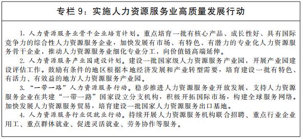 加快人力资源服务业高质量发展。推动人力资源服务与实体经济融合发展,引导人力资源服务机构围绕产业基础高级化、产业链现代化提供精准专业服务。鼓励人力资源服务业管理创新、技术创新、服务创新和产品创新,大力发展人力资源管理咨询、高级人才寻访、人才测评等高技术、高附加值业态。实施人力资源服务业领军人才培养计划。开展“互联网+人力资源服务”行动。深化人力资源服务领域对外开放,探索建设国家人力资源服务出口基地。