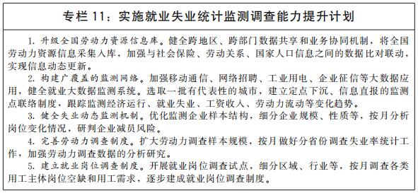 完善就业失业统计监测调查体系。加快构建系统完备、立体化的就业失业监测网络,实现劳动力市场、企业用工主体和劳动者个体全覆盖,全面反映就业增长、失业水平、市场供求状况。完善就业统计指标体系和调查统计方法,探索进行就业质量、就业稳定性等方面的分析。推进大数据在就业统计监测领域的应用。