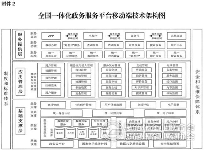 全国一体化平台移动端技术架构主要包括基础支撑层、应用管理层和服务提供层。(技术架构图见附件2)基础支撑层主要为政务服务平台移动端提供国家电子政务外网、政务云平台等基础设施,数据资源服务、大数据分析等数据支撑,统一身份认证、统一证照共享、统一电子印章等公共支撑以及事项管理、“好差评”管理、用户体验监测等业务支撑。