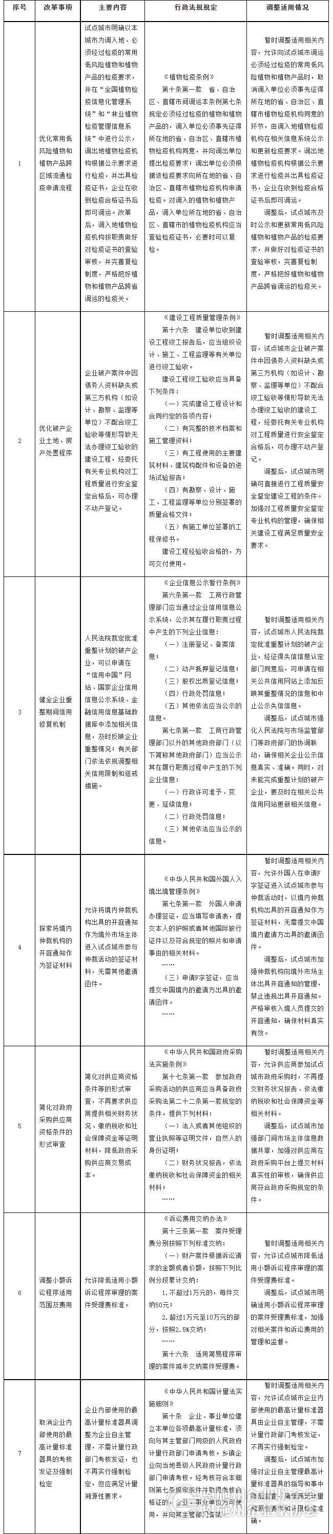 (十五)强化法治保障。按照重大改革于法有据的要求,依照法定程序开展营商环境创新试点工作。国务院决定,根据《全国人民代表大会常务委员会关于授权国务院在营商环境创新试点城市暂时调整适用〈中华人民共和国计量法〉有关规定的决定》,3年内在营商环境创新试点城市暂时调整适用《中华人民共和国计量法》有关规定;同时,在营商环境创新试点城市暂时调整适用《植物检疫条例》等7部行政法规有关规定。国务院有关部门和有关地方人民政府要根据法律、行政法规的调整情况,及时对本部门和本地区制定的规章、规范性文件作相应调整,建立与试点要求相适应的管理制度。对试点成效明显的改革举措,要及时推动有关法律、法规、规章的立改废释,固化改革成果。
