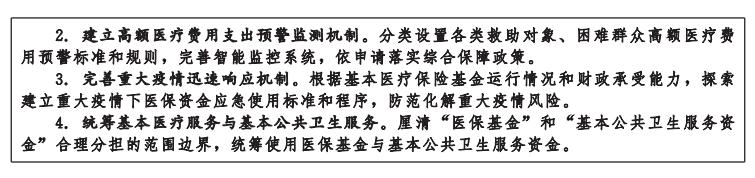 健全重大疫情医疗保障机制。健全与重大疫情应急管理等级和高中风险地区相衔接的医保应急响应机制和医保支付政策,探索重大疫情应急药品、医疗耗材和试剂等临时纳入医保范围和集中采购联调联动机制;建立重大疫情特殊群体、特定疾病医药费豁免制度,有针对性免除医保目录、支付限额、用药用量等限制性条款。统筹使用医保基金与公共卫生服务资金,促进基层社区医防融合,健全分级诊疗制度。