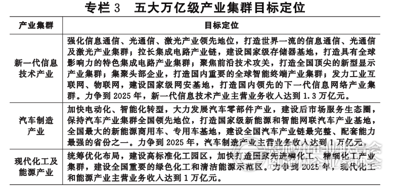 (一)培育壮大战略性新兴产业。围绕“51020”现代产业集群,对每个产业集群实行“一张产业地图、一个实施方案、一位省领导领衔、一个专家团队跟进、一套工作专班服务”的“五个一”工作机制。开展产业链精准招商,加快提升4个国家级战略性新兴产业集群综合竞争力,新增8个以上省级战略性新兴产业集群。打造世界一流的“光芯屏端网”等新一代信息技术产业,建成全国领先的汽车制造、现代化工、大健康、航空航天产业基地和现代农产品加工新高地。加快482个亿元以上重大新兴产业项目建设投产,高技术制造业增加值增长15%以上。