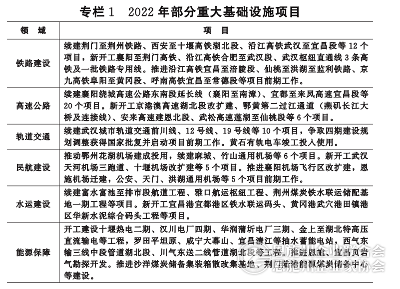 (一)积极扩大有效投资。围绕产业、交通、城建、环保、文旅等方面,谋划一批管当前、利长远、引领性强、辐射带动作用广的重大项目。抢抓国家宏观政策窗口期,紧盯重大引调水工程、城市燃气管道、粮食安全、污水处理等重点投向,加快地方政府专项债发行使用,加大项目推进力度。落实“要素跟着项目走”要求,加强项目审批、资金、土地、环境等方面服务保障,对所有亿元以上的项目实行“点对点”服务,全力推进5771个亿元以上续建项目加快建设,5516个亿元以上新开工项目尽快开工。新开工襄阳至荆门高铁、沿江高铁合肥至武汉段、武汉枢纽直通线、鄂黄第二过江通道、天河机场三跑道、鄂北水资源配置二期、罗田平坦原、汉川电厂四期、华润蒲圻电厂三期等重大基础设施项目。