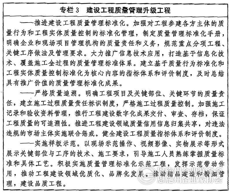 (十五)打造中国建造升级版。坚持百年大计、质量第一,树立全生命周期建设发展理念,构建现代工程建设质量管理体系,打造中国建造品牌。完善勘察、设计、监理、造价等工程咨询服务技术标准,鼓励发展全过程工程咨询和专业化服务。完善工程设计方案审查论证机制,突出地域特征、民族特点、时代风貌,提供质量优良、安全耐久、环境协调、社会认可的工程设计产品。加大先进建造技术前瞻性研究力度和研发投入,加快建筑信息模型等数字化技术研发和集成应用,创新开展工程建设工法研发、评审、推广。加强先进质量管理模式和方法高水平应用,打造品质工程标杆。推广先进建造设备和智能建造方式,提升建设工程的质量和安全性能。大力发展绿色建筑,深入推进可再生能源、资源建筑应用,实现工程建设全过程低碳环保、节能减排。