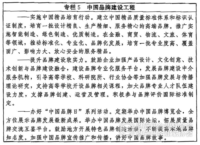 ——品牌建设取得更大进展。品牌培育、发展、壮大的促进机制和支持制度更加健全,品牌建设水平显著提高,企业争创品牌、大众信赖品牌的社会氛围更加浓厚,品质卓越、特色鲜明的品牌领军企业持续涌现,形成一大批质量过硬、优势明显的中国品牌。